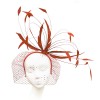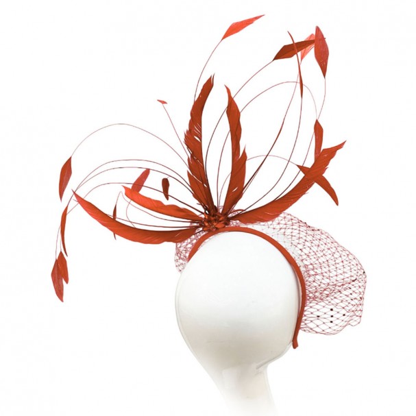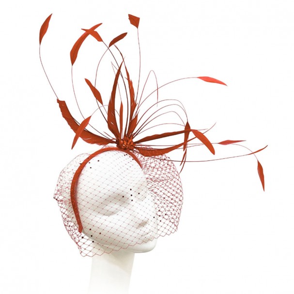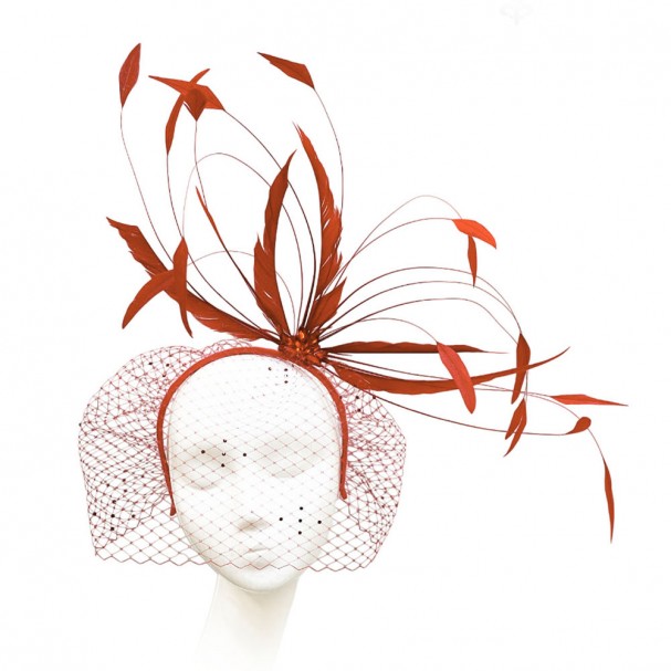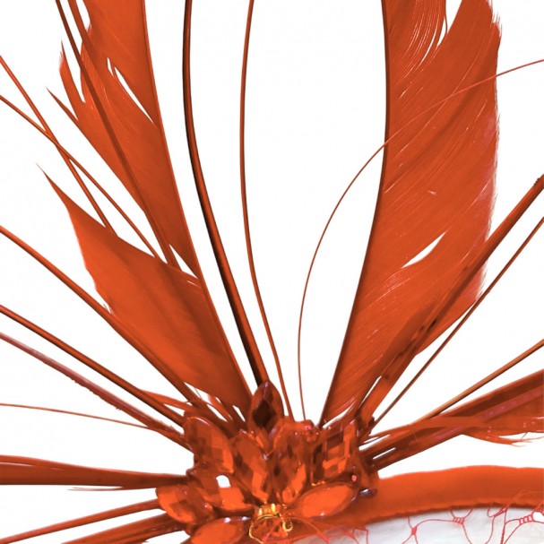 A headband with a veil, decorated with feathers and rhinestones. This hat is a one-of-a-kind piece. Reproduction is possible with modifications.